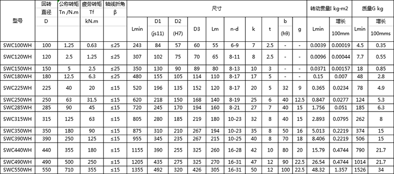 SWC-WH聯軸器 特點及應用場合:聯接兩個不同軸線的軸系傳動,不能緩沖、減振,采用整體叉頭結構,軸承固定不用螺栓,避免了螺栓松動斷裂,便于維修,延長使用壽命,可靠性高,承載能力大、傾角大,可在β≤5°~25°工況下工作。適用于軋鋼機械、起重運輸、工程機械、石油機械及其他重型機