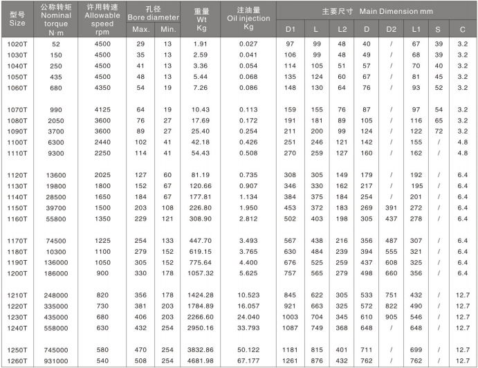 福克T10聯(lián)軸器的參數(shù)及主要尺寸