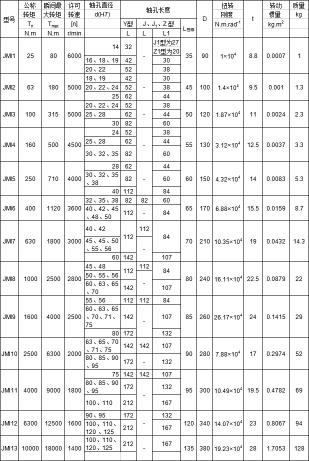 JMI型膜片聯軸器基本參數和主要尺寸(JB/T 9147-99) mm